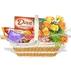 Уменьшенный: роза кустовая (микс) 20 см - 3 шт., конфеты "DOVE Promises" - 1 шт., шоколад "Milka" - 1 шт., Twix - 1 шт., чай "Greenfield" - 1 шт., печенье "Alpen Gold" - 1 шт., декоративная зелень, оазис, корзина средняя.